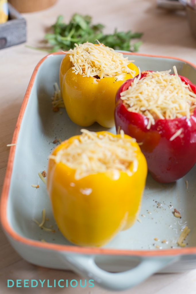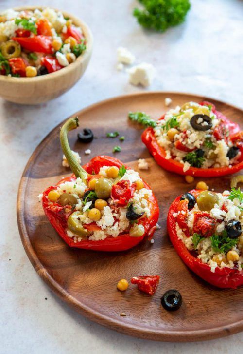 Gevulde paprika met couscous en feta kaas, 'n vega paprika gerecht uit de oven.